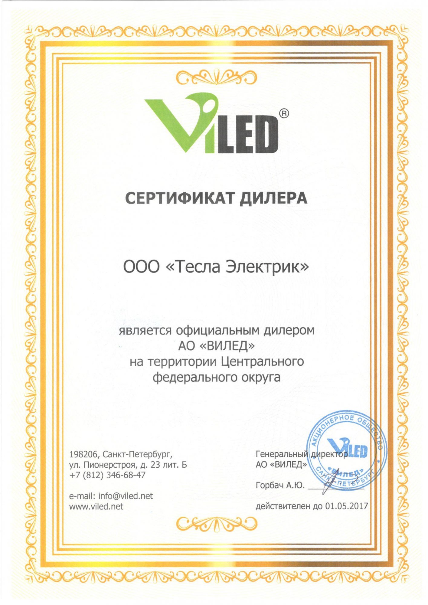 Сертификат официального дилера АО «ВИЛЕД» на территории Центрального федерального округа.