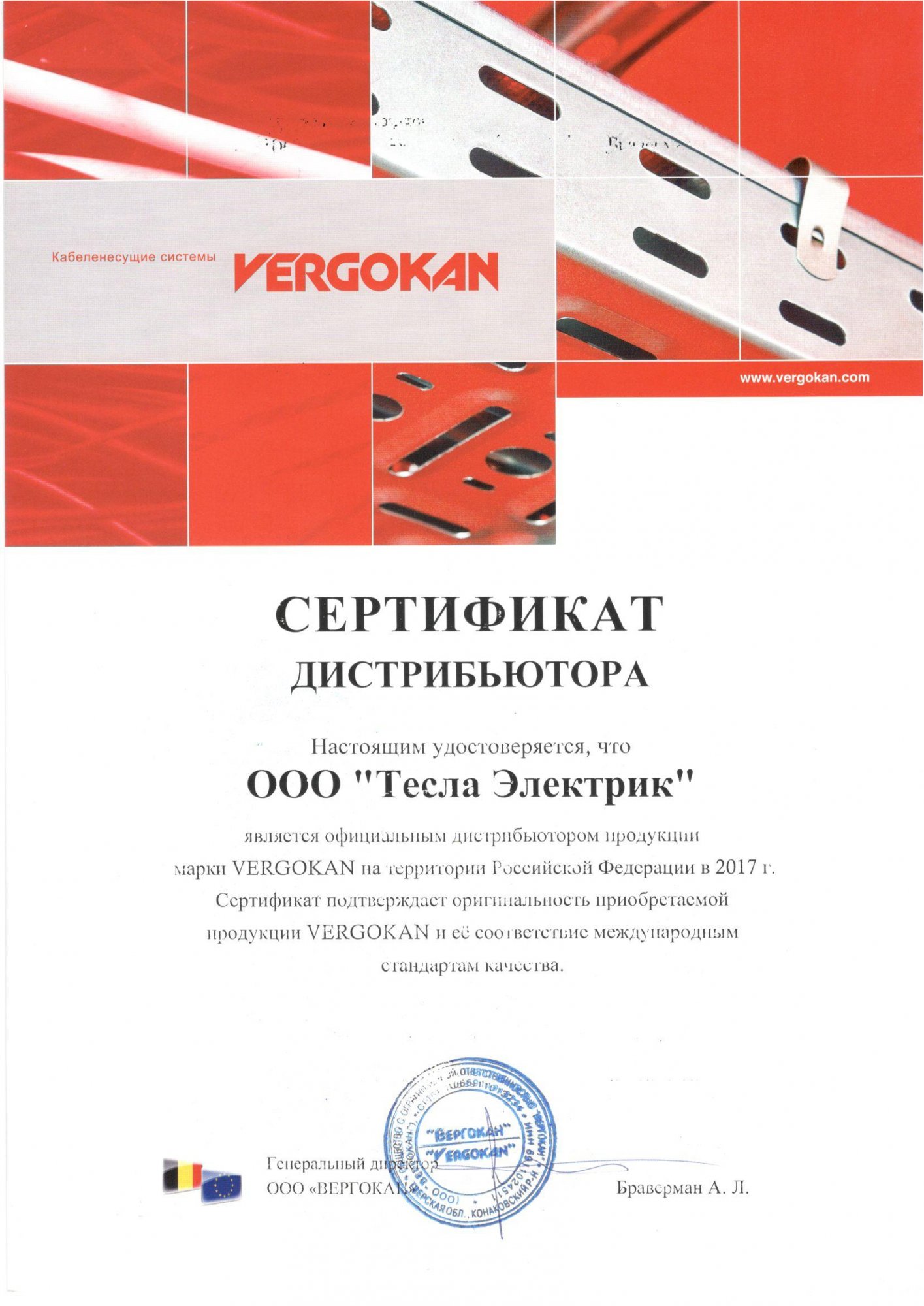 Сертификат официального дистрибьютора продукции VERGOKAN на территории России.