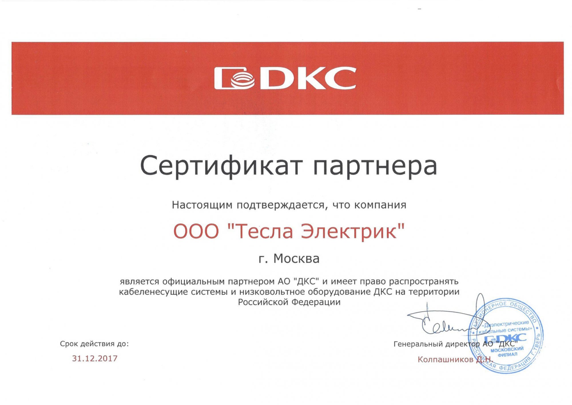 Сертификат подтверждает, что «Тесла Электрик» является официальным партнером АО «ДКС», и имеет право распространять продукцию компании на территории России.